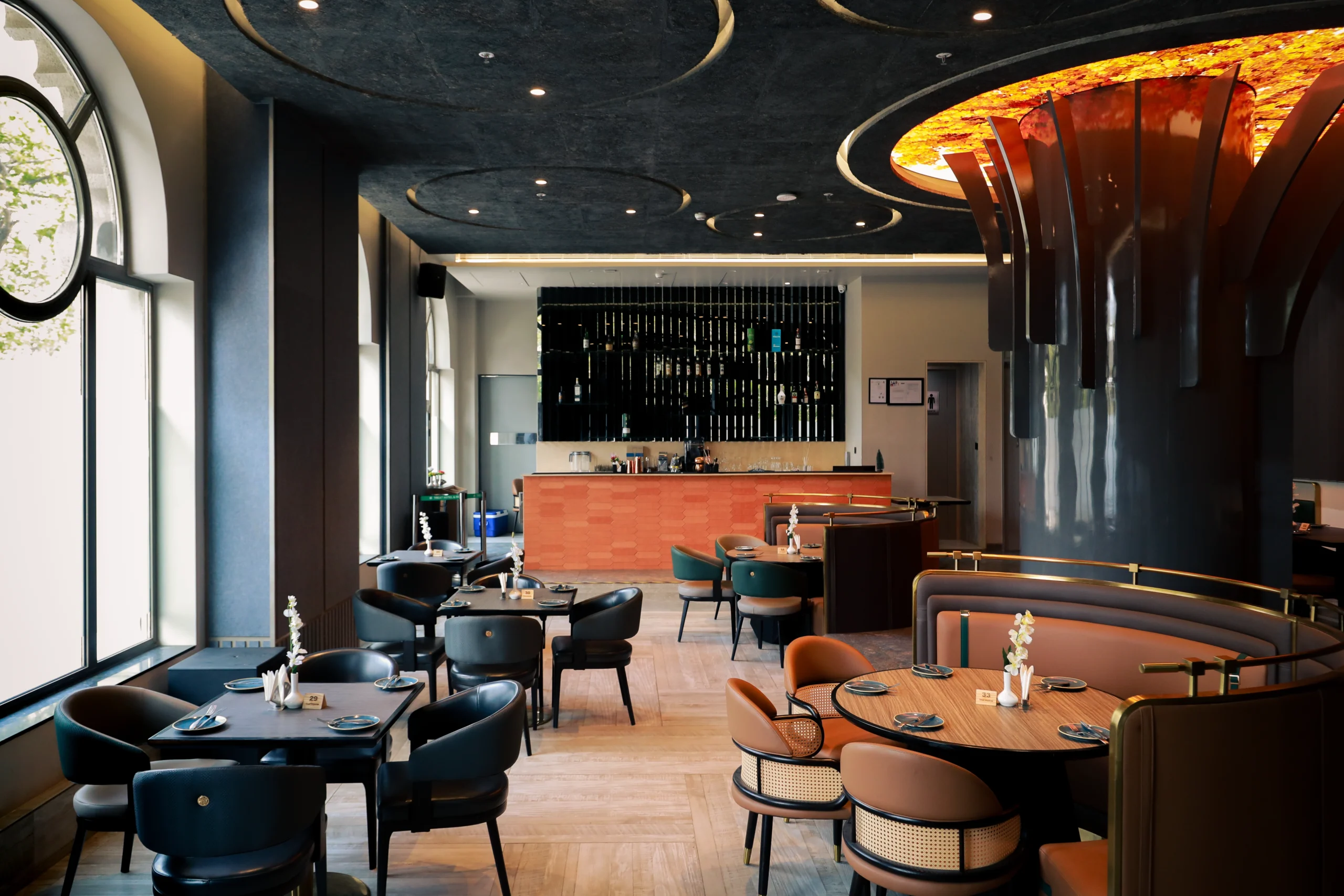 A sophisticated bar and dining lounge offering an elevated social experience, where fine spirits meet curated cuisine in an ambience of understated luxury.