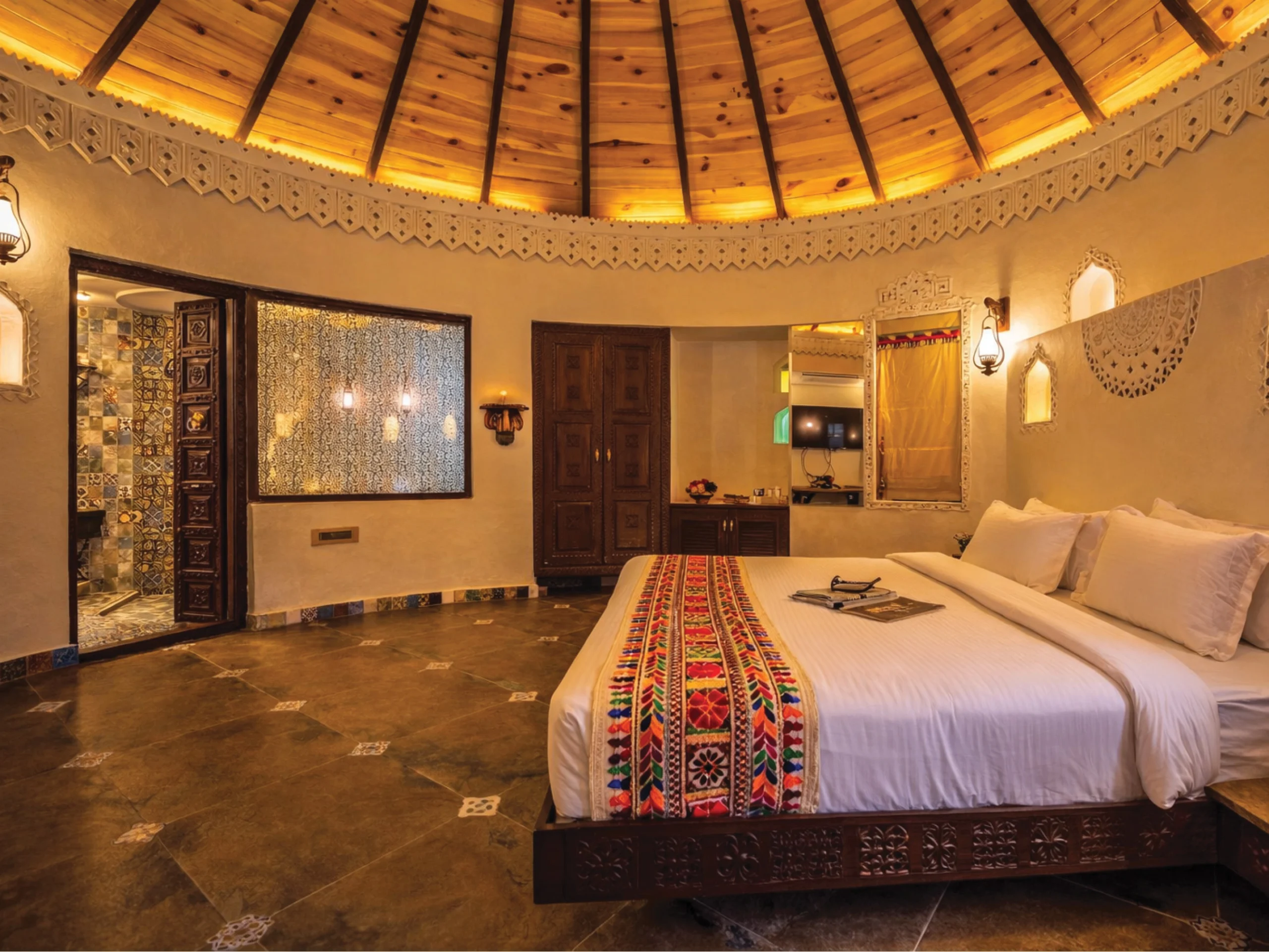 The Rajwadi Suite keeps all the warmth of our heritage cottages and adds generous space. A larger bedroom, separate living room, dining area, and dressing space. Ideal for families, wedding guests, or longer stays that deserve a touch of class.